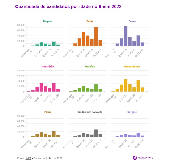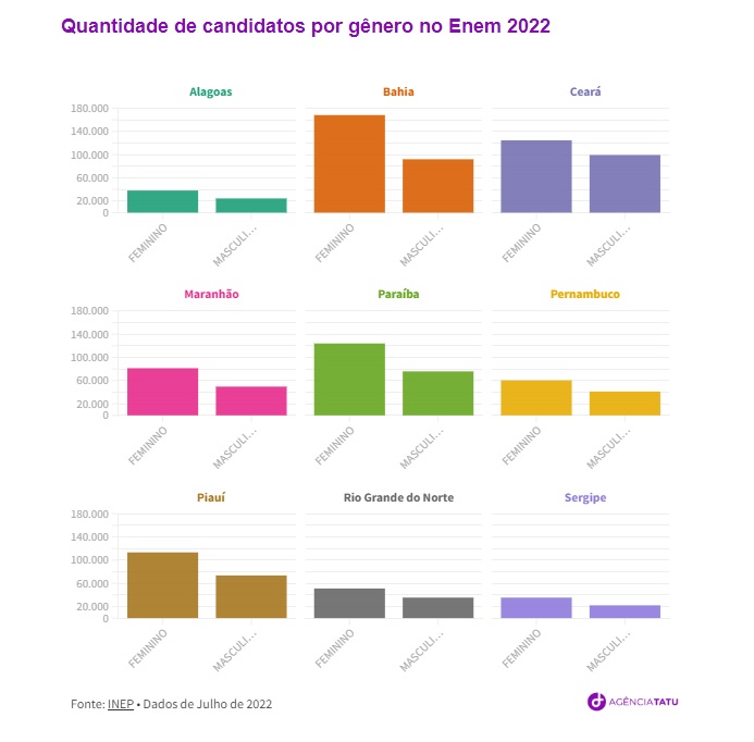 Perfil dos candidatos ao Enem em Sergipe - Com somente 57.396 pessoas, Sergipe tem a menor quantidade de inscritos; 56.470 no Enem impresso e somente 926 no Enem Digital. Entretanto, o estado também segue o perfil apanhado do Nordeste. São 35.369 mulheres, 31.719 candidatos negros e 15.599 pessoas entre 21 e 30 anos.