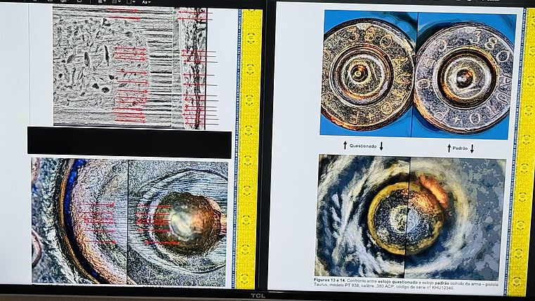 Suely Mauricio, perita criminal responsável pelo exame, explicou como o procedimento foi realizado com o auxílio do microcompadorador balístico. No equipamento, ela confrontou os três projéteis removidos do cadáver da vítima, e os estojos encaminhados pela Delegacia de Homicídios de Proteção à Pessoa (DHPP) com as amostras padrões produzidas com as munições que vieram com a arma apreendida.