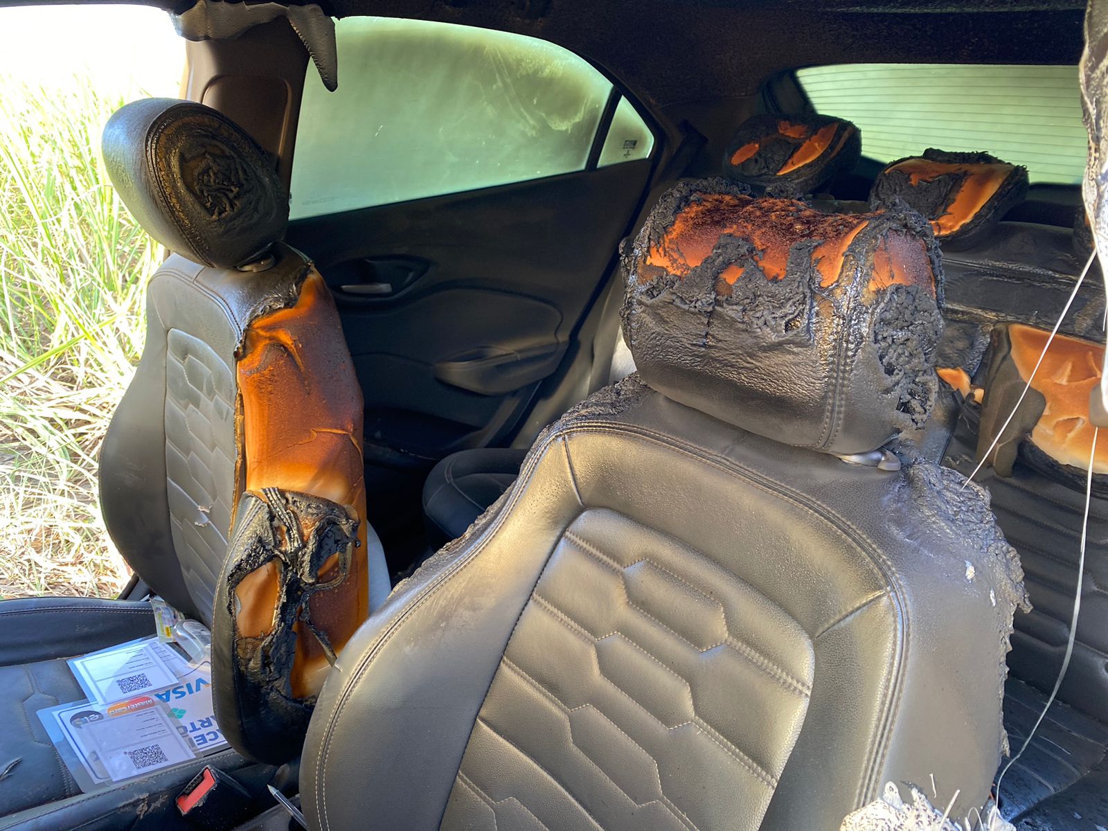 Os bancos, o teto e o vidro da frente do automóvel estavam com marcas do incêndio. Folhas secas foram colocadas dentro do tanque do carro.