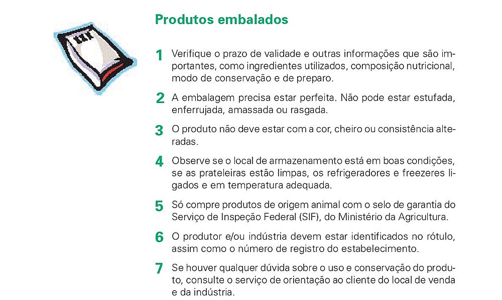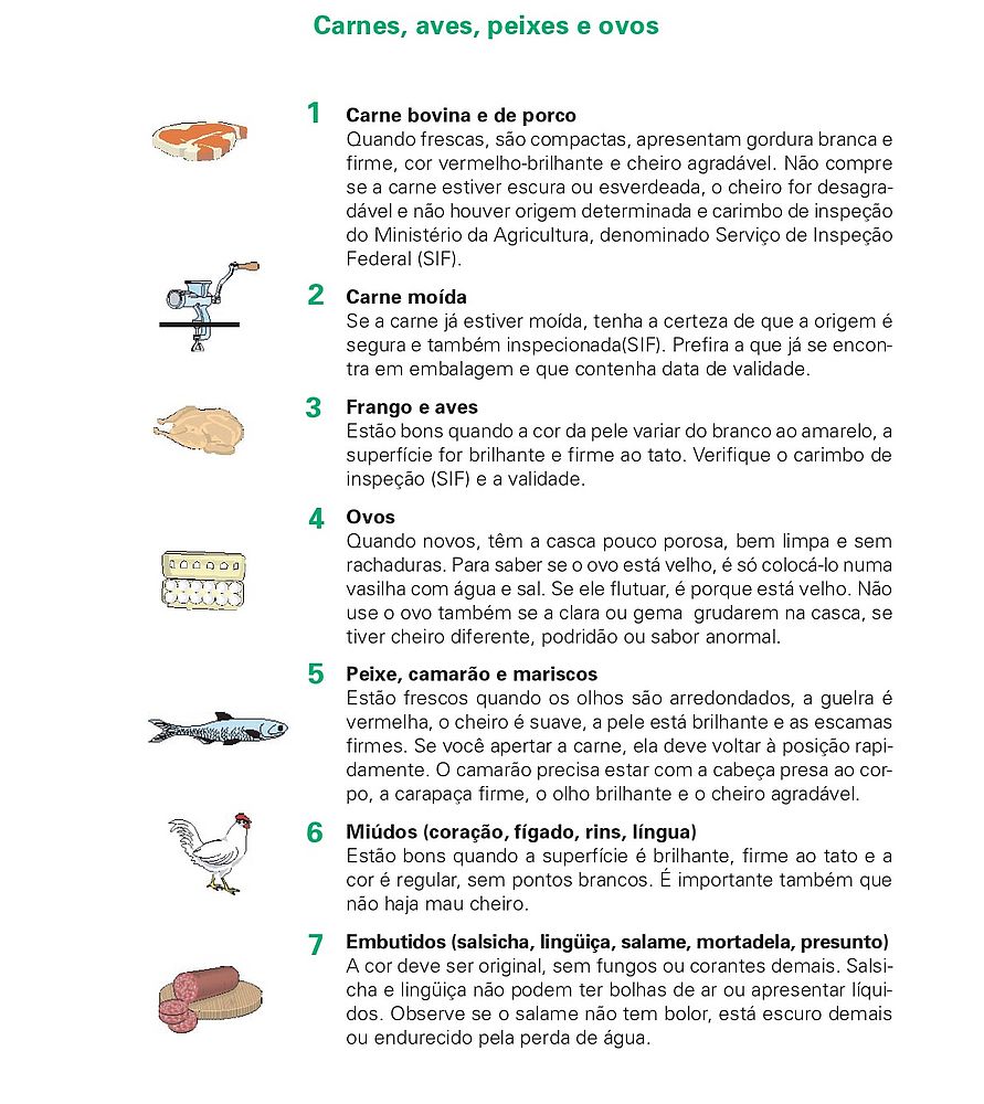 O Ministério da Saúde disponibiliza cartilha (BAIXE AQUI) com orientações úteis na hora de adquirir alimentos sejam enlatados, carnes, aves, peixes, hortaliças e frutas. O valor nutritivo dos alimentos depende de muitos fatores. Um deles é a época da estação ou da safra (para frutas e vegetais). O cheiro, a cor e a textura dos alimentos também vão influenciar seu valor nutritivo. Tudo isso deve ser observado na hora da escolha e da compra. Veja algumas dicas que você encontra na cartilha.
