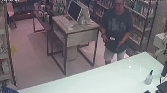 “Ele entrou na farmácia, começou a perguntar sobre um produto que estava na vitrine e pediu para que eu anotasse o preço. Eu me dirigi para o outro balcão para pegar o bloco de anotações e anotar o preço do produto, deixando meu celular iPhone na bancada da loja. Assim que passei o valor, ele saiu logo em seguida. Quando percebi a falta do celular fui verificar nas imagens e constatei que ele teria furtado o aparelho”, disse a vítima.