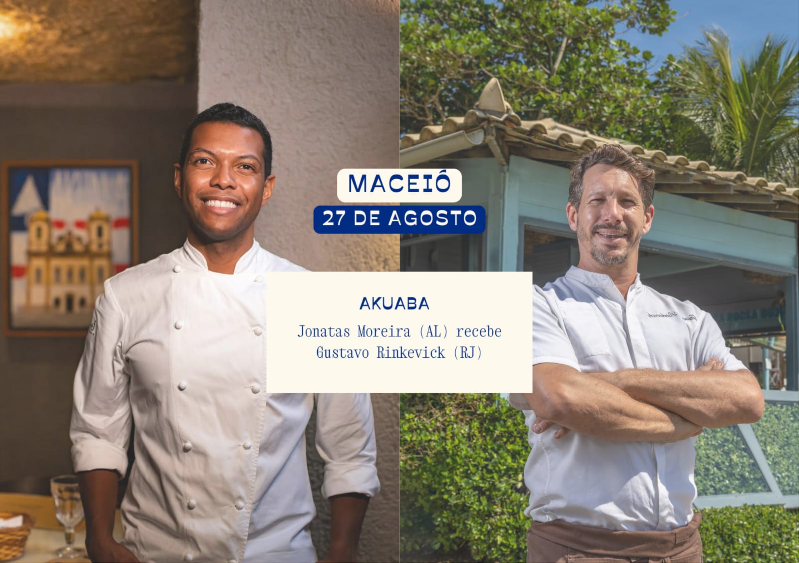 Maceió: quarta-feira (27), às 20h, o chef Jonatas Moreira, do Akuaba, recebe o chef Gustavo Rinkevich, do Rocka Restaurant & Beach Lounge.