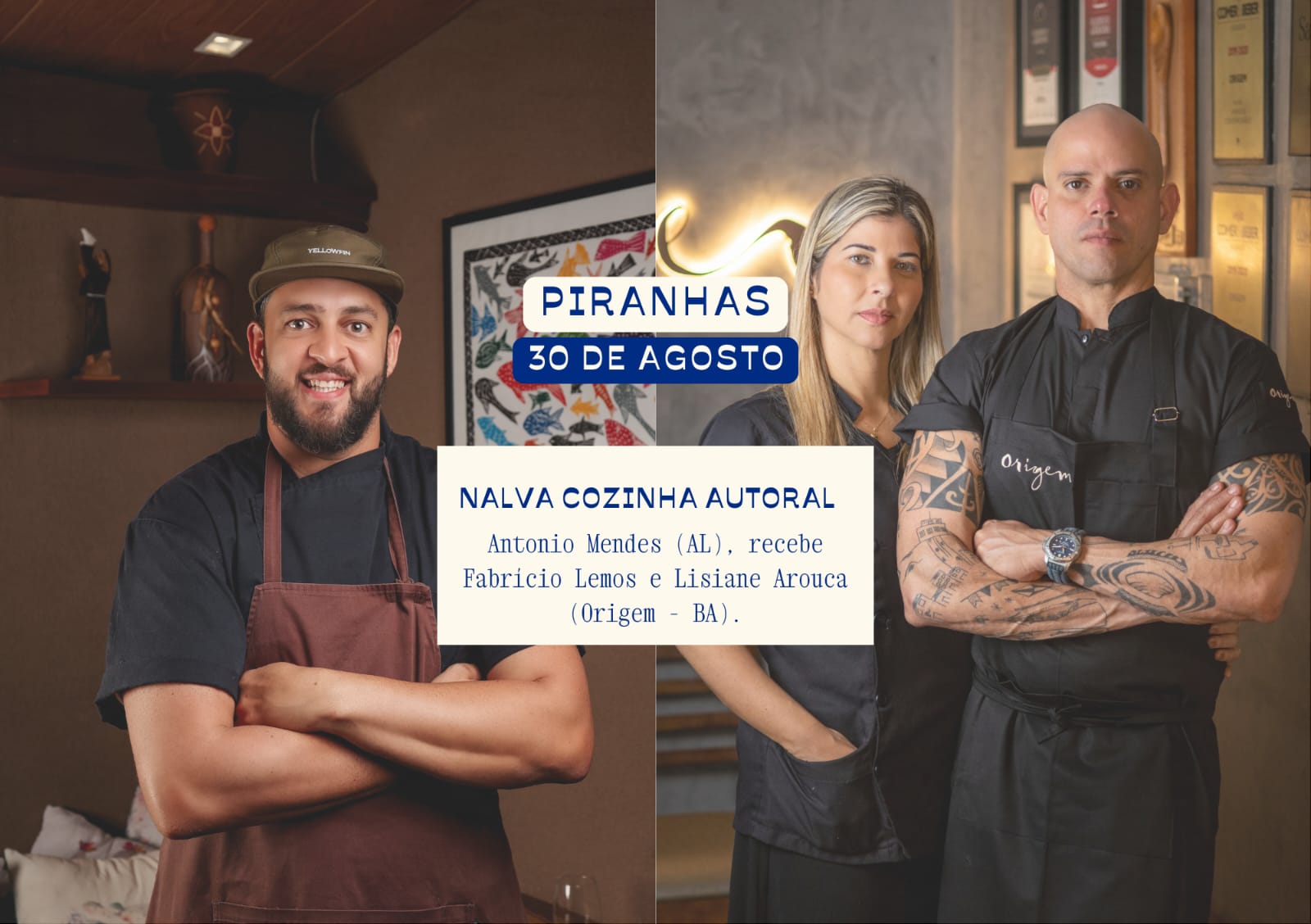 Como nasceu a Rota dos Pescados Alagoanos: Em todo canto, tem sempre alguém que sai da curva, e mergulha nas águas do Rio São Francisco em busca de histórias, assim fez o chef Antônio Mendes (Nalva, Cozinha Autoral), trocou Maceió pela cidade de Piranhas, além das panelas também virou pescador e estudioso dos pescados das águas doces. Do Velho Chico para sua cozinha surge linguiça e mortadela de peixe, para celebrar essa nova dos era pescados reuniu os amigos chefs: (Mahr Gastronomia, Parrilla do Mar), Roger Lima e Jonatas Moreira (Akuaba)para embarcar do mar ao sertão com receitas inéditas, como por exemplo o feijão vermelho vira taco para receber o pitú glaceado no missô, melaço e gengibre, cebola marinada, brotos de coentro e maionese fermentada de cactos pelo chef Antônio. Será o manjar de todos santos do São Francisco até Nossa Senhora dos Prazeres, padroeira de Maceió.