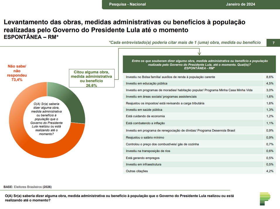 Um levantamento da empresa Paraná Pesquisas apontou que 73,4% dos brasileiros não sabem citar uma medida ou benefício à população que o governo do presidente Luiz Inácio Lula da Silva (PT) fez ou está fazendo, enquanto que 26,6% disseram que sabiam. A divulgação foi feita nessa segunda-feira, 12.