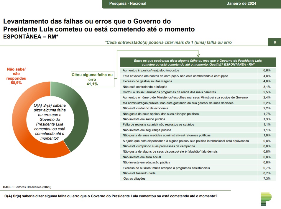 A Paraná também perguntou se as pessoas saberiam citar falhas ou erros referentes à administração do petista até o momento. Desta vez, o questionamento foi: “O(A) Sr(a) saberia dizer alguma falha ou erro que o governo do presidente Lula realizou ou está realizando até o momento?”.