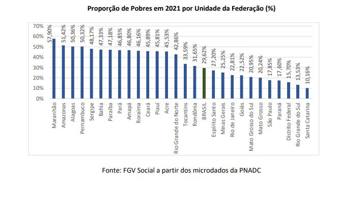Ainda segundo o mapa da FGV, o estado que apresentou a menor incidência de pobreza em 2021 foi Santa Catarina, com apenas 10,16%, seguido do Rio Grande do Sul (13,53%) e Distrito Federal (15,70%).