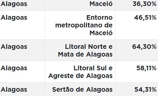 Já a capital Maceió, com 36,30%, e a Região Metropolitana, com 46,51%, apresentaram números abaixo da média de outras regiões de Alagoas.