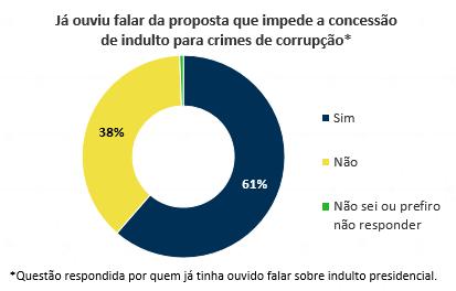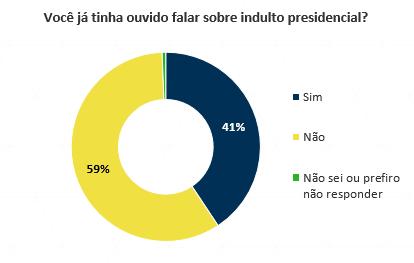 O Instituto de Pesquisa DataSenado, em parceria com o gabinete do senador Lasier Martins, realizou pesquisa de opinião para ouvir os brasileiros sobre a PEC 89/2019, que veda a concessão do indulto presidencial para condenados por crimes de corrupção. Mais da metade dos brasileiros (59%) diz nunca ter ouvido falar sobre o indulto presidencial, enquanto 41% afirmam já ter ouvido falar a respeito. Entre os entrevistados que já ouviram falar sobre o indulto, 61% já ouviram falar da PEC 89/2019, ao passo que 38% afirmam não ter ouvido falar dessa proposta.