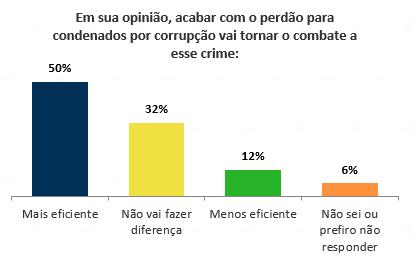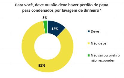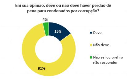 A maioria dos entrevistados acham que não deve haver perdão de pena para condenados por corrupção (81%) ou para condenados por crime de lavagem de dinheiro (85%). Dos entrevistados, 15% se disseram a favor do perdão para condenados por corrupção e 12% concordam com o perdão para condenados por lavagem de dinheiro. Além disso, para metade dos brasileiros a proibição do perdão para condenados por corrupção tornará o combate a esses crimes mais eficiente (50%). Aproximadamente um a cada três participantes da sondagem, contudo, acreditam que esta medida não fará diferença no combate a corrupção (32%).