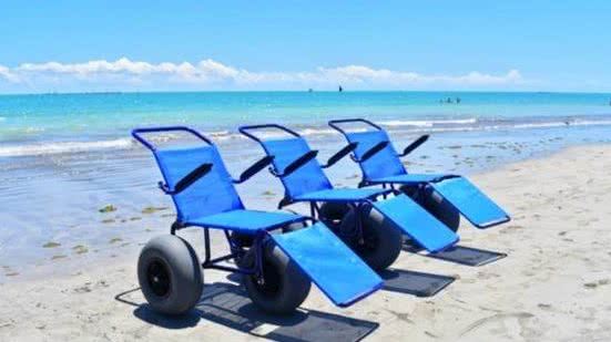 As cadeiras anfíbias possuem rodas especiais que permitem o deslocamento na areia e que a pessoa flutue no mar. Os equipamentos possuem ainda cinto de segurança regulável, encosto, assento, apoio cervical para a cabeça e apoio para os pés.