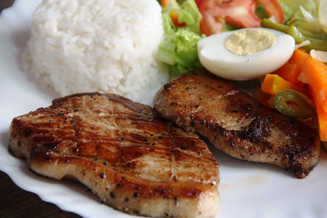 Como sou fã da carne de porco, provei a bisteca: sal no ponto certo, textura macia e, claro, gotas de limão para aguçar o paladar. O prato vem com salada crua, legumes cozidos, arroz e purê de batata.