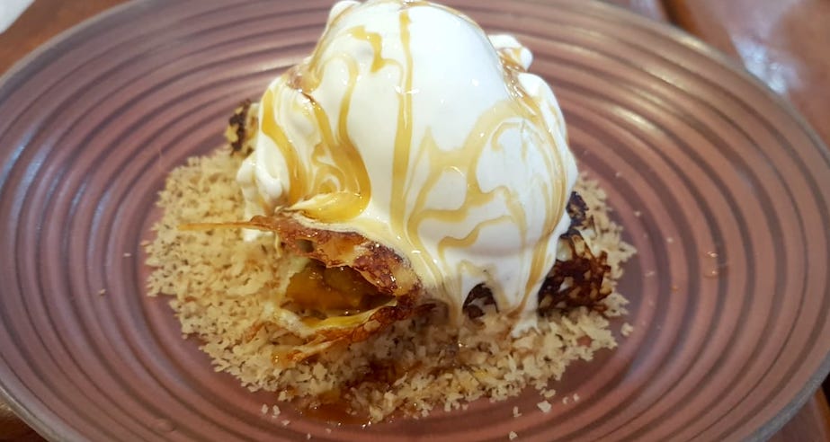 Cartola do chef Rodrigo, uma tapioquinha com banana, mel, sorvete de tapioca e farofa de coco
