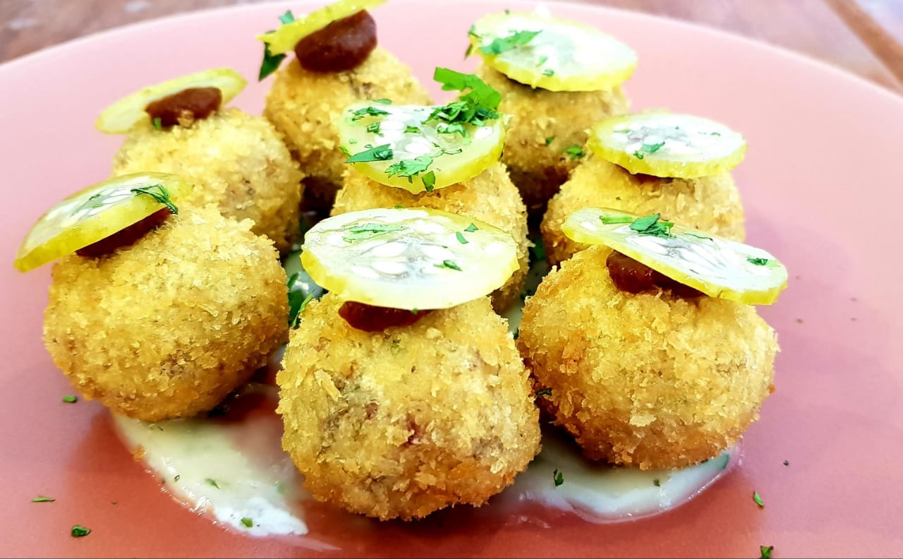 Croqueta (bolinho) de porco coroado pelo maxixe