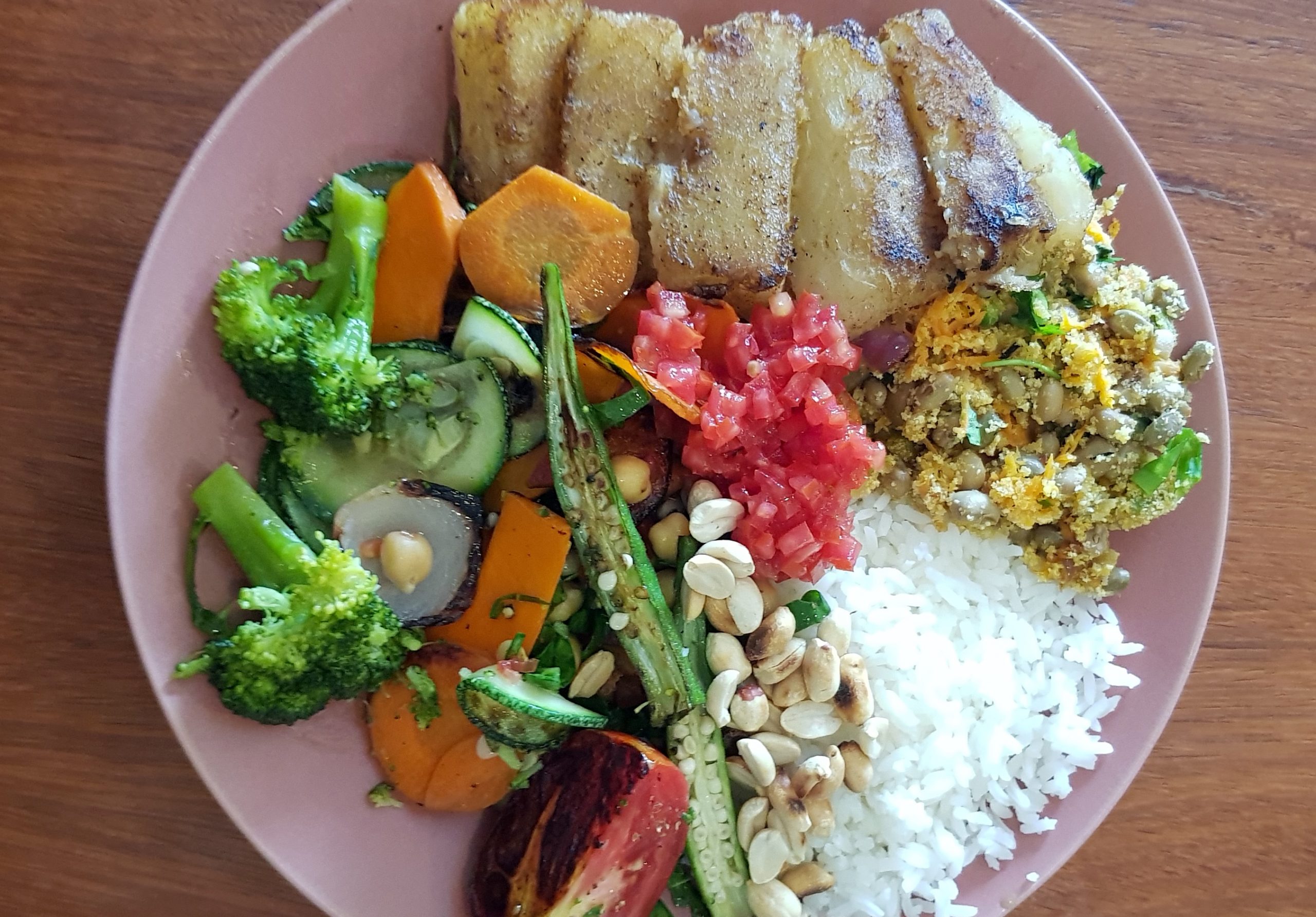 Rodrigo Aragão também tem propostas sem carne, e um prato que também conquistou meu coração: feijão tropeiro com legumes temperados com sal, pimenta, azeite, macaxeira selada na chapa, arroz branco, e salada de tomates maduros. Recomendo sem medo de ser feliz.