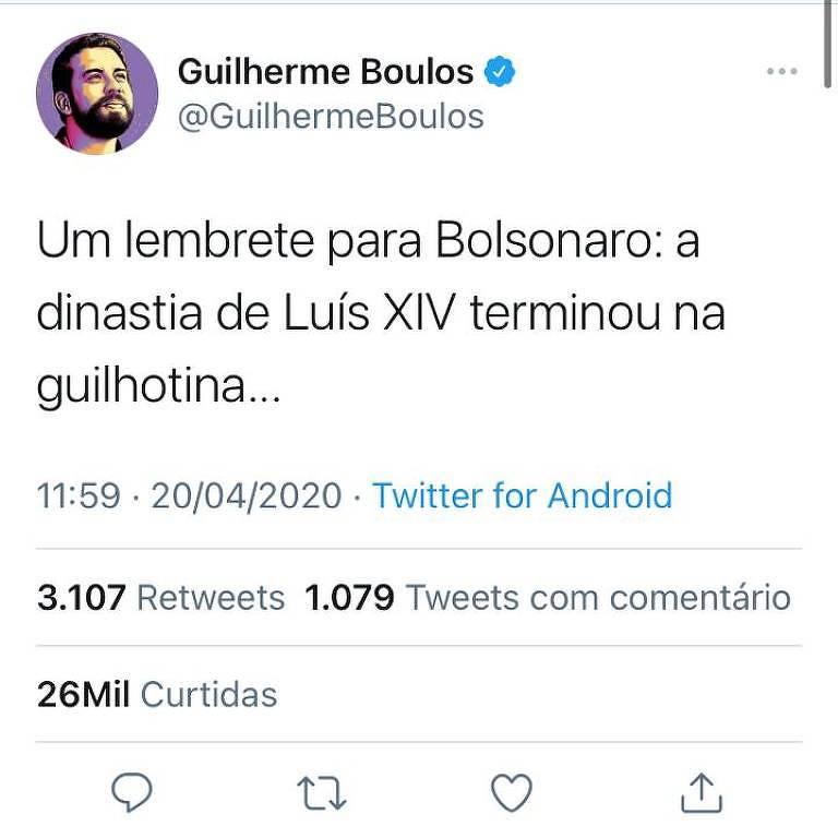 “Um lembrete para Bolsonaro: a dinastia de Luís XIV terminou na guilhotina...”, escreveu no Twitter o psolista, que terá de se apresentar à superintendência da PF em São Paulo no próximo dia 29, às 16 horas.