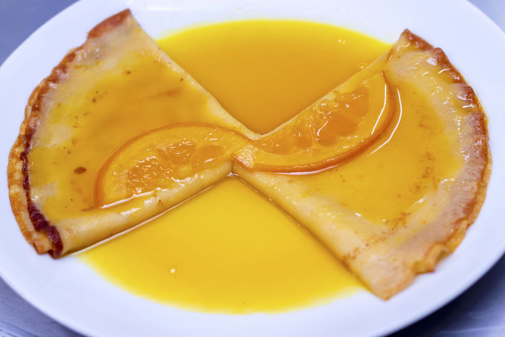 Crepe Suzette, uma massa de crepe preparada na manteiga, suco de laranja e flambada