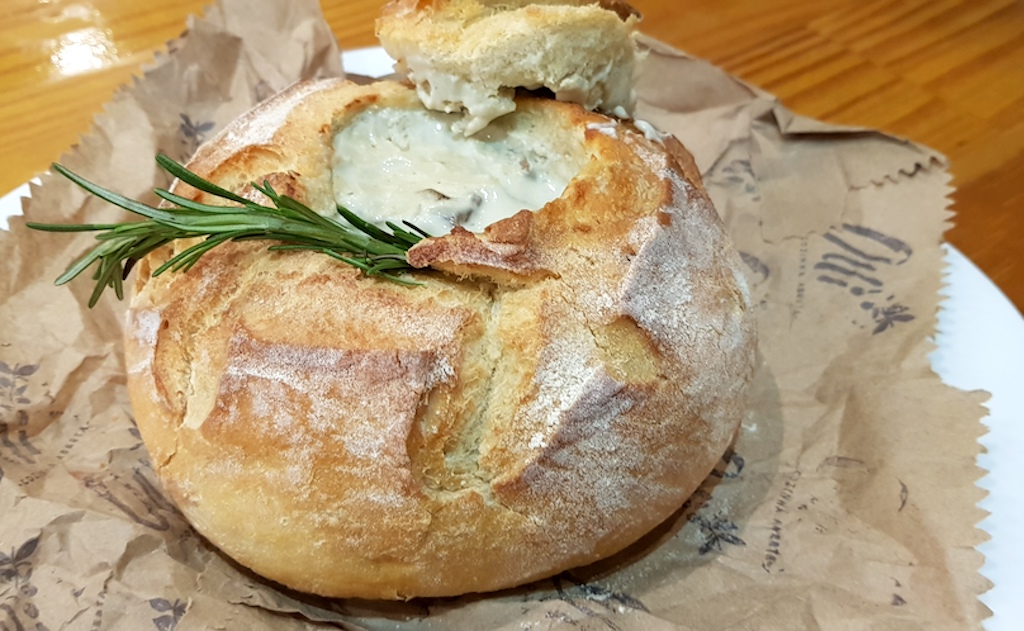 No Olli tem sempre uma opção vegana, mas também tem comidinhas para acompanhar uma taça de vinho do contêiner vizinho, Bem Vinos (@bemvinos), a exemplo do pãozinho italiano com filezinho ao molho creme de queijo. Esse é bom para compartilhar.