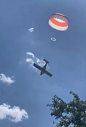 Muitos aviões pequenos têm paraquedas instalados como medida de segurança, para serem acionados em um pouso de emergência. Normalmente paraquedas de emergência permitem um pouso horizontal. Aparentemente, neste caso, a cauda do avião ficou presa nas linhas.
