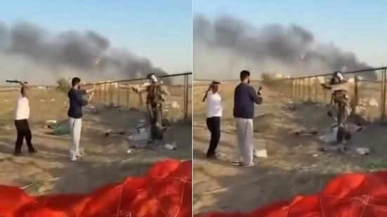 Nas imagens, um grupo de moradores locais grita ameaças para o piloto, que ainda estava preso ao paraquedas após seu avião ter sido um dos abatidos acidentalmente por fogo amigo após o início do ataque coordenado por EUA e Israel contra o Irã, no último sábado (28/2).