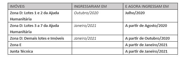 Com o novo calendário, a Braskem antecipa em quatro meses a entrada dos moradores da Zona D no fluxo de compensação. Já os moradores do lote 1 e 2 da Ajuda Humanitária, que entrariam no fluxo em outubro, começam a ser chamados em julho. Os lotes 3 a 7, que teriam entrada em janeiro de 2021, serão chamados em agosto. Já os lotes de 8 a 12 e demais moradores da Zona D, que estavam previstos para início em janeiro de 2021, serão atendidos na compensação em outubro deste ano. Os imóveis incluídos no programa por meio da Junta Técnica e moradores da Zona E ingressam no fluxo de compensação em janeiro de 2021.