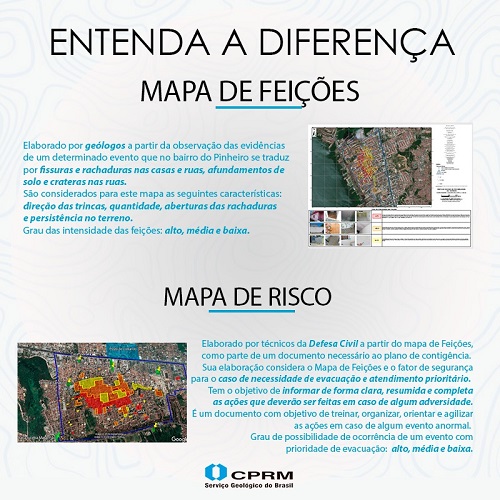 A partir dos estudos iniciados pelo Serviço Geológico do Brasil (CPRM) no bairro Pinheiro, para esclarecer o surgimento de rachaduras na região, dois mapas foram elaborados. O primeiro, o Mapa de Feições, é resultado dos levantamentos técnicos realizados por pesquisadores da CPRM e que delimita a área afetada pelo fenômeno ainda de causa desconhecida, com identificação dos locais onde foram observadas mais ou menos evidências. Já o Mapa de Riscos, elaborado pela Defesa Civil de Maceió, é um produto que faz parte do Plano de Contingência.