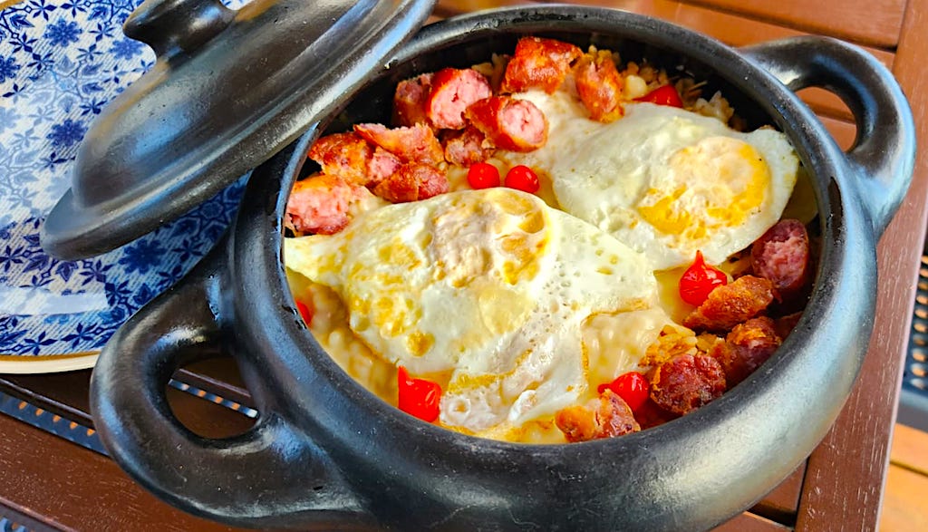 Panelinha de carne serenada (carne de sol) com arroz, linguiça e ovo do Divino Lounge Café,