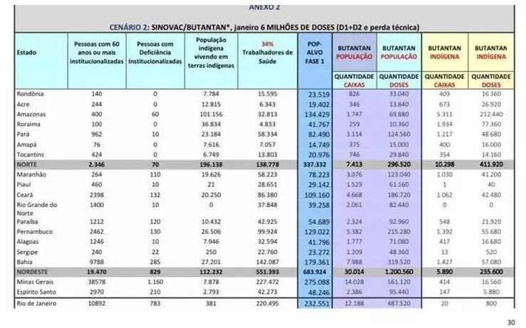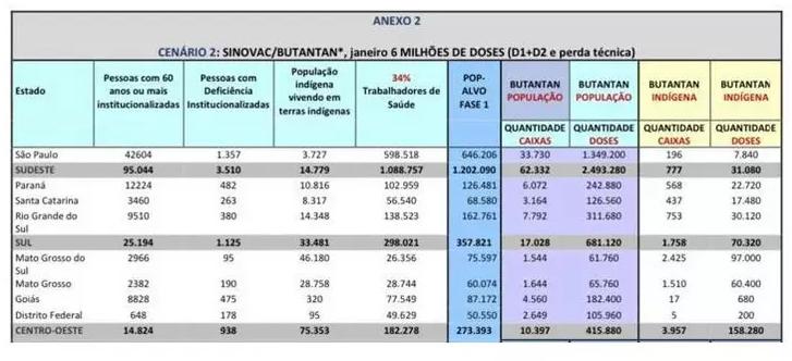 Veja, abaixo, a quantidade prevista para ser distribuída a cada estado, segundo o Ministério da Saúde - considerando 6 milhões de doses fornecidas pelo Instituo Butantan.
