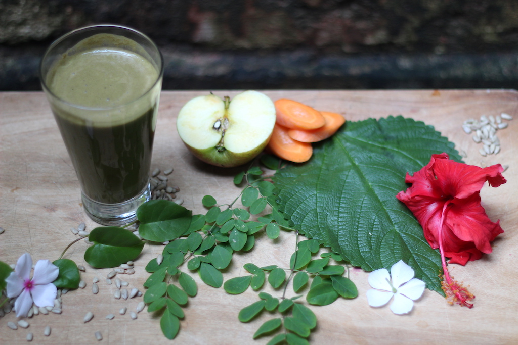 Suco verde de flores e folhas: Flor branca (Maria sem vergonha), bertalha, moringa, urtiga, cenoura, maçã, semente de girassol sem casca germinado, flor Papoula ou hibiscos ou mimo-de-vênus (são da família Hibiscus rosa-sinesis). Também levou outras folhas, como alface crespa roxo, chicória, acelga, couve, folha de pitanga, hortelã da folha grossa, gengibre e pepino. Detalhe: não leva água e nem açúcar, mas é docinha e refrescante.