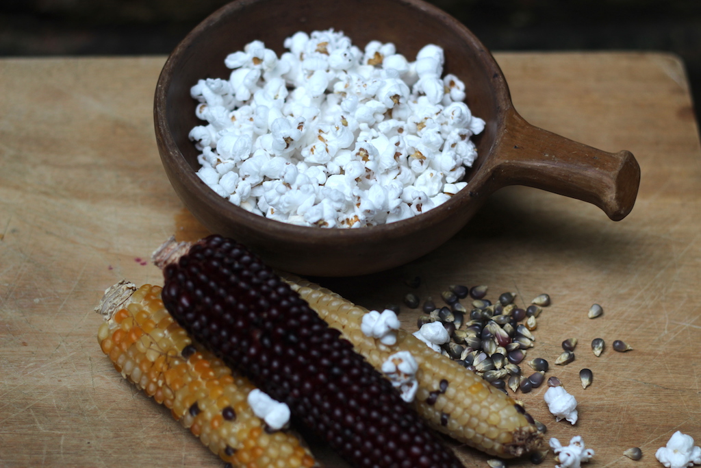 Pipoca feita de milho crioulo azul e espigas de milho crioulo