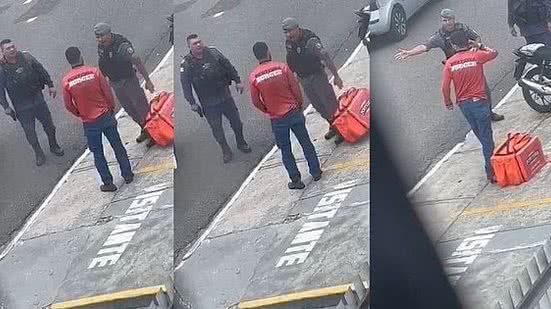 Imagens que circulam nas redes sociais mostram o momento em que os PMs fazem a abordagem, revistam o homem que trabalha com serviços de entrega por aplicativo e, bastante alterados, os agentes gritam com o rapaz.