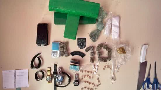 Também foram recolhidos materiais relacionados ao tráfico, como uma balança de precisão, uma faca tipo peixeira, duas tesouras, bolsas plásticas e uma caderneta de anotações. Além disso, os policiais apreenderam a quantia de R$1.072,40 em espécie, sete relógios de pulso e três celulares.