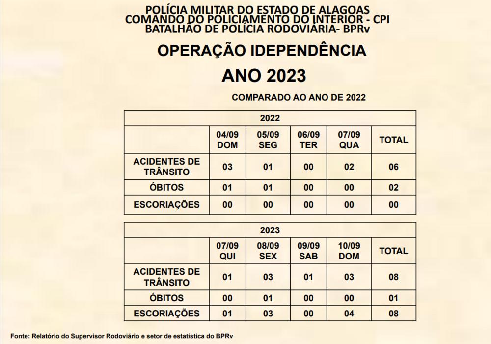 Ainda segundo os dados da PM, nesse último feriado foi registrada apenas uma morte em rodovias estaduais de Alagoas. No mesmo período em 2022, foram registradas duas mortes.