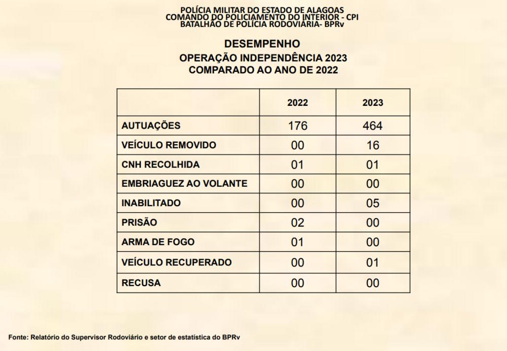 A Polícia Militar de Alagoas divulgou, na tarde desta segunda-feira (11), o balanço da "Operação Independência ", que foi realizada nas rodovias estudais de Alagoas nesse feriado prolongado de 7 de Setembro. De acordo com os dados, houve um aumento de 163% no número de autuações, se comparado com o mesmo período em 2022.