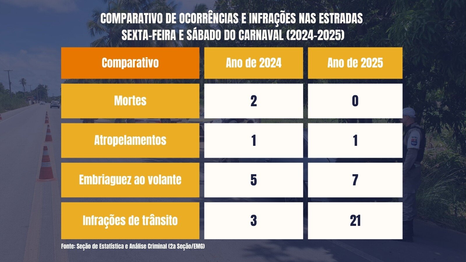 Dados da Seção de Estatística e Ciência Aplicada da Corporação, relativos à sexta e sábado de Carnaval, mostram que as ações do BPRv resultaram no aumento da notificação de casos de embriaguez ao volante.
