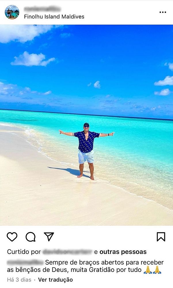Ostentação - De acordo com a Polícia Civil, Ronie tinha pelo menos quatro carros de luxo, avaliados em R$ 3 milhões. Os veículos foram apreendidos durante a operação. Nas redes sociais, o sargento, que se identifica como "Ronie Malibu", faz questão de mostrar os bens. Além dos veículos de luxo, viagens para destinos como China e Dubai estão expostos na galeria virtual. Há dois dias, Ronie postou uma foto nas Ilhas Maldivas, considerado um dos destinos mais caros do mundo. "Sempre de braços abertos para receber as bênçãos de Deus, muita gratidão por tudo", diz a legenda da foto (veja abaixo).