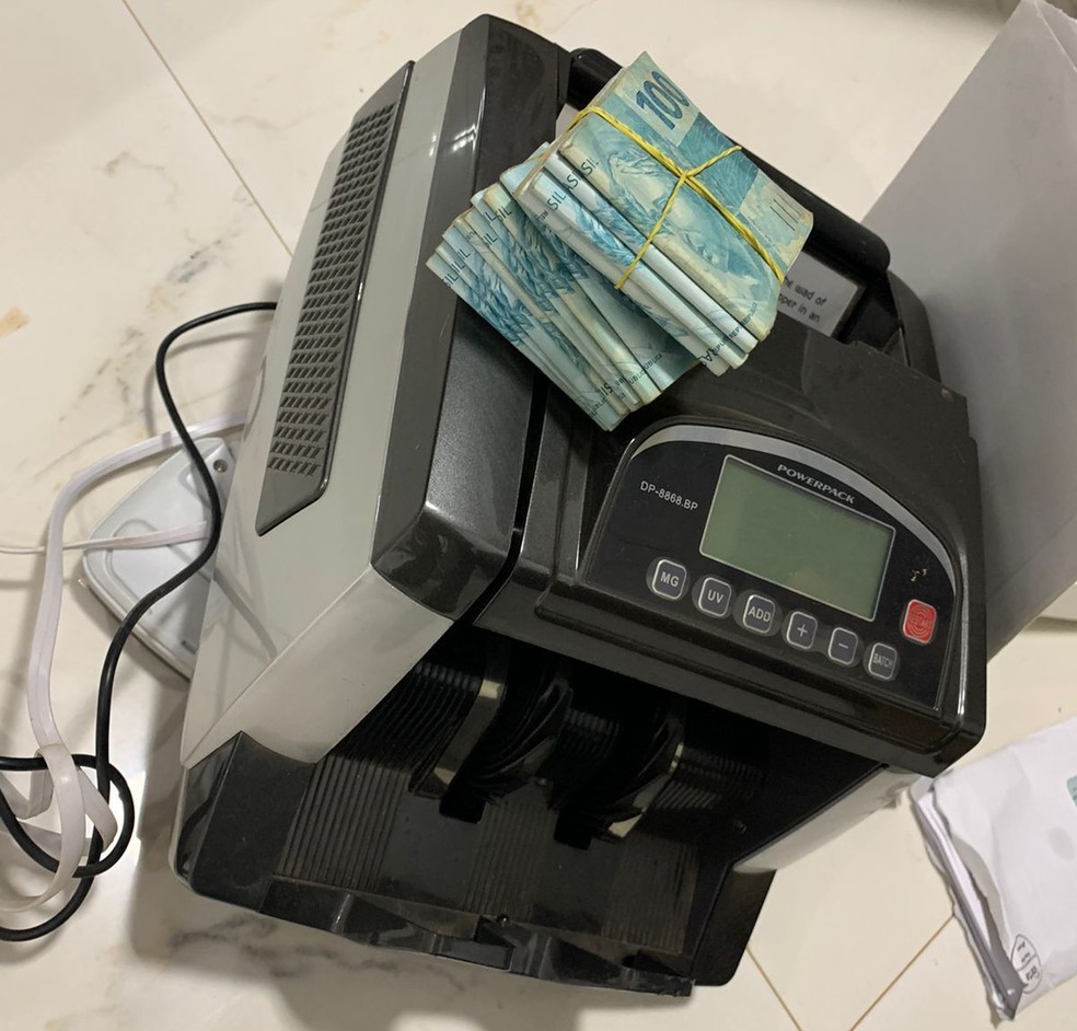 Máquina de contar cédulas e dinheiro apreendidos durante operação, no DF — Foto: PCDF/Divulgação