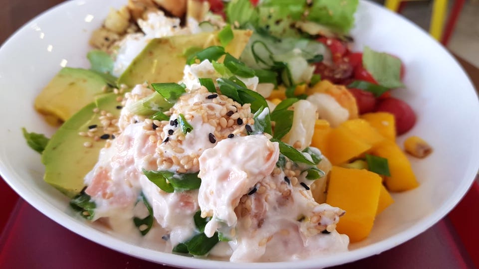 O cliente escolhe uma proteína, que pode ser salmão, atum, camarão ou funghi com shitake (versão vegetariana) que já vem com a base de arroz japonês, bifum ou arroz integral, e mais cinco ingredientes, como abacate, tomate, abacaxi, acelga…. Todos são finalizados com gergelim torrado, coco, queimado com limão, cebolinha verde e amendoim