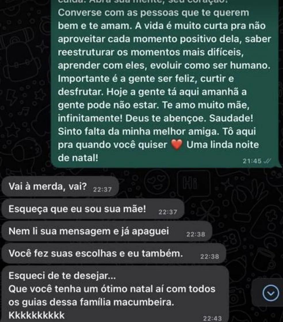 Esta semana, o Fantástico teve acesso a uma outra troca de mensagens de WhatsApp entre a atriz e a mãe, Silvana Taques, acontecida no dia 24 de dezembro de 2022, que mostra a gravidade do desentendimento.