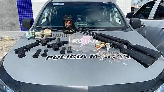 Também foram apreendidos de uma pistola calibre 380 com quatro carregadores e 11 munições, duas espingardas de pressão, dois simulacros de arma de fogo, R$ 28.494,00 em espécie, além de seis pulseiras, quatro colares um anel, todos de prata, e três relógios de marca.