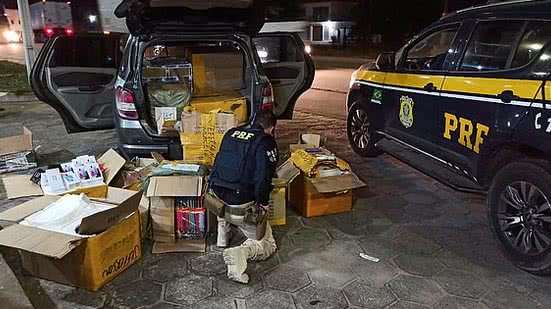 A Polícia Rodoviária Federal (PRF) apreendeu, na noite de segunda-feira, quase 10 mil produtos sem Nota Fiscal. O caso aconteceu no km 206 da BR-101 em São Sebastião/AL. Por volta das 22 horas, uma equipe abordou um táxi Chev/Spin, de cor cinza, com motorista e passageiro. Durante a fiscalização, o condutor apresentou uma nota fiscal de roupas, entrentanto, ao vistoriar o veículo foram encontrados diversos produtos eletrônicos e outras mercadorias semelhantes, localizadas em caixas no interior do veículo.
