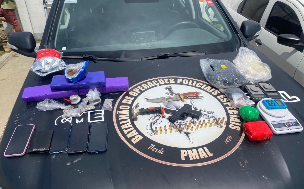 Também foram encontrados um simulacro de pistola, 30 munições de calibre .380, três balanças de precisão e quatro aparelhos celulares.