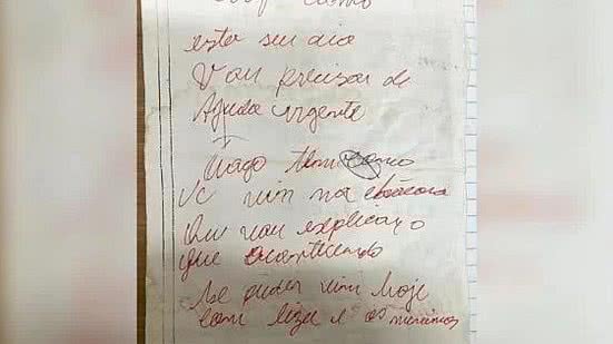 "Chefe, como está seu dia. Vou precisar de ajuda urgente. Thiago tem como vc vim na chácara que eu vou explicar o que [está] acontecendo. Se puder vim hoje com Liza e os meninos", traz o conteúdo do bilhete encontrado pela polícia.