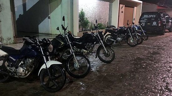 Foram apreendidas quatro motos modelo Honda Fan nas cores azul, vermelha e duas pretas. Também uma Titan azul e uma Honda Broz preta.