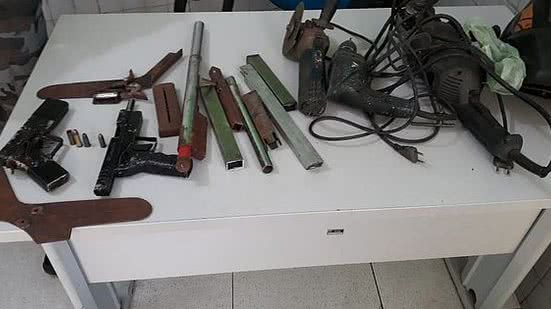 A equipe recebeu uma denúncia e se deslocou ao local, realizando o flagrante.No local foi encontrado duas armas de fogo, cinco cartuchos para calibres diferentes, uma furadeira, um colar de aço, um celular, 10 peças de metal para fabricação de arma, R$ 20 e uma carteira com documentos pessoais.