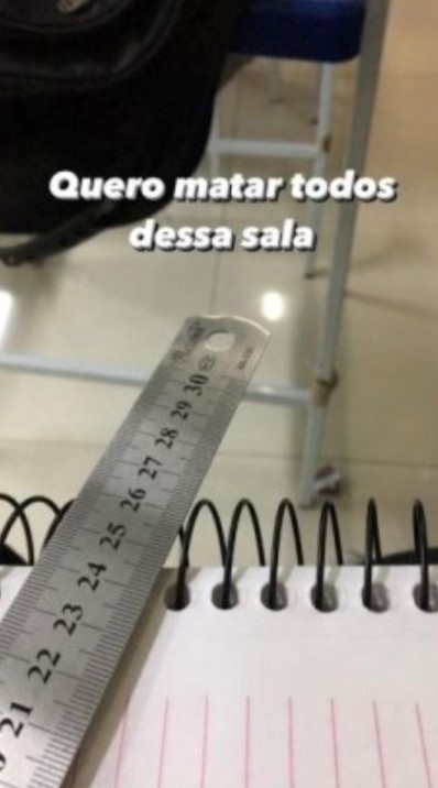 Em uma das mensagens, o estudante do 3º ano do Ensino Médio postou a foto da sala de aula com a legenda: “Queria matar todos dessa sala”. Confira o print abaixo: