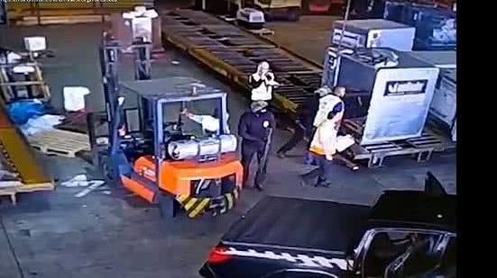 Enquanto um carro permaneceu na portaria para dar cobertura, outro foi até o terminal de cargas, onde criminosos renderam o chefe da segurança do local. Este grupo, segundo a polícia, era composto por cinco criminosos encapuzados, empunhando fuzil, pistolas, além de espingardas calibre 12.