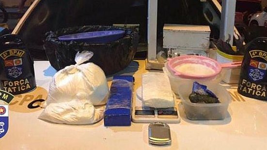 Ao todo, foram apreendidos 3,65 kg de cocaína, 1,1 kg de maconha, uma prensa artesanal, duas balanças de precisão, e dois celulares. A cocaína estava guardada em sacos plásticos.