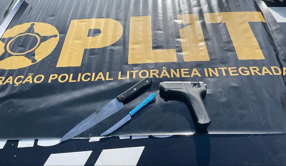 Os policiais encontraram com o suspeito um simulacro de arma de fogo, que ele utilizou para ameaçar a vítima, proprietária da motocicleta, além de duas facas.