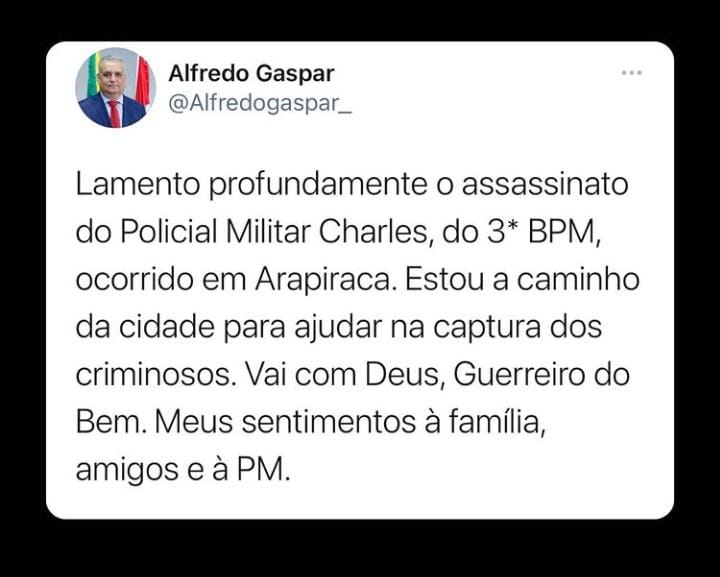 Pelas redes sociais, o secretário estadual de Segurança Pública, Alfredo Gaspar de Mendonça, lamentou a morte do PM, e anunciou que estaria indo a Arapiraca para ajudar na captura dos criminosos.