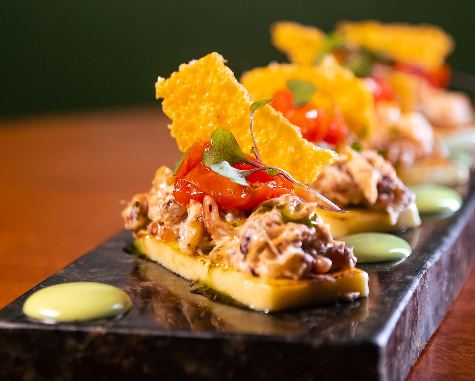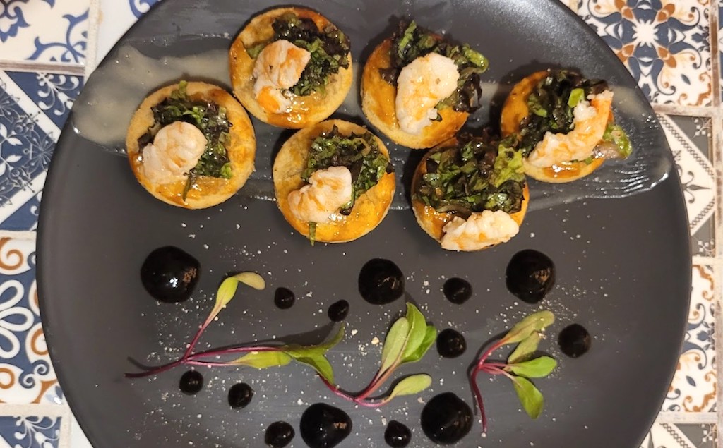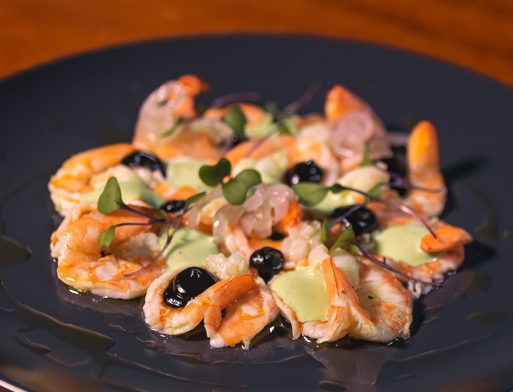 O ceviche de camarão também merece atenção, o crustáceo é marinado com especiarias, ovas de Capelin e chips de banana da terra com páprica defumada.